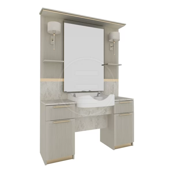 Decorul cu membrana neagra și benzile elegante de margine din inoxidabil auriu ofera un aspect modern, maximizand in acelasi timp functionalitatea. Chiuveta speciala pentru *barbering* ofera cel mai potrivit spațiu de lucru pentru frizeri prin designul sau spatios.