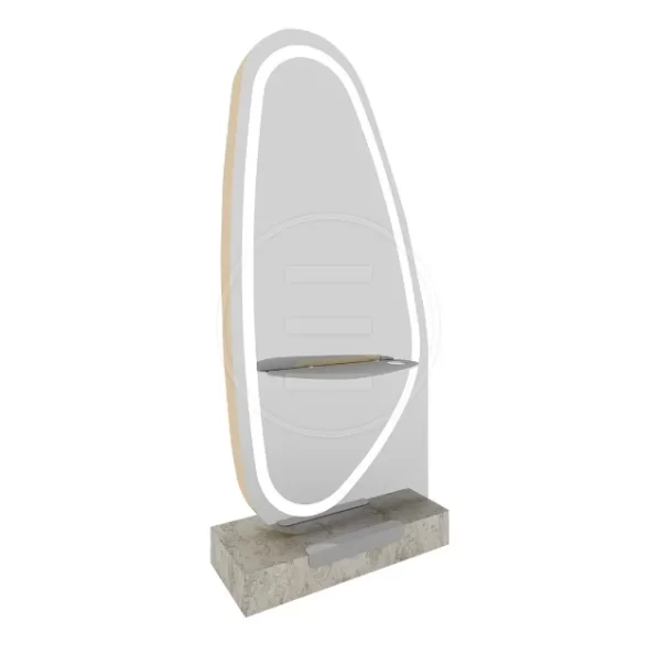 Blatul mesei este realizat din material Corian, in timp ce oglinda este realizata din oglinda flotanta cu iluminare led si detaliata cu o banda aurie. Designul acestei oglinzi permite ca doi stilisti profesionistii sa poata lucra împreuna confortabil.