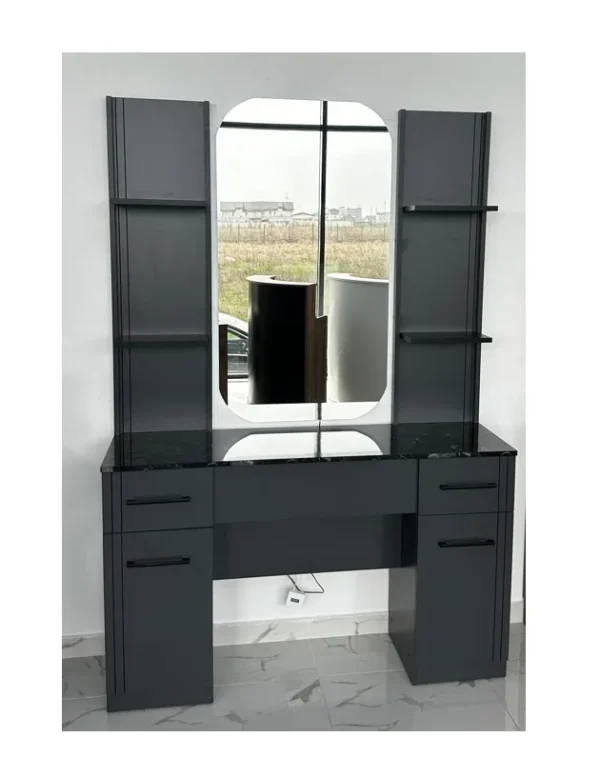 Postul de frizerie Kanton Antrasit, prin aspectul sau original, incadreaza perfect orice spatiu, acesta devenind foarte versatil. Spoturile si rafturile de expunere produse deschid spatiul salonului catre unicitate.