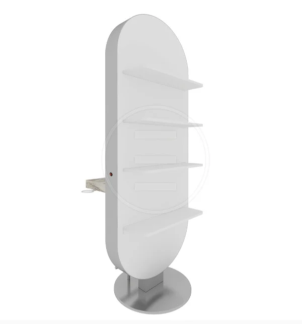 Postul de lucru coafor Alpeda GLAM ISLAND WITH SHELF iese în evidență prin forma sa eliptică și iluminarea LED sofisticată, reflectând abordarea noastră inovatoare de design, adăugând în același timp eleganță saloanelor cu rama sa din oțel inoxidabil și oglinda flotantă mată.