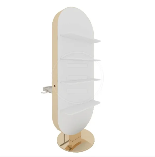 Postul de lucru coafor Alpeda GLAM ISLAND WITH SHELF iese în evidență prin forma sa eliptică și iluminarea LED sofisticată, reflectând abordarea noastră inovatoare de design, adăugând în același timp eleganță saloanelor cu rama sa din oțel inoxidabil și oglinda flotantă mată.