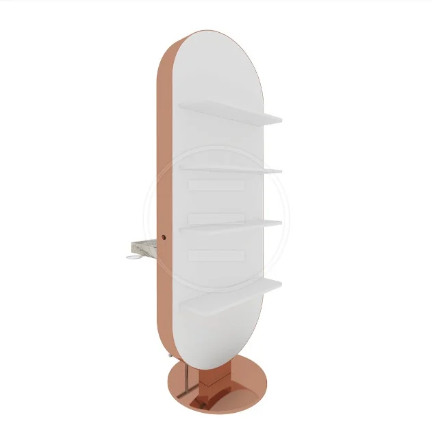 Postul de lucru coafor Alpeda GLAM ISLAND WITH SHELF iese în evidență prin forma sa eliptică și iluminarea LED sofisticată, reflectând abordarea noastră inovatoare de design, adăugând în același timp eleganță saloanelor cu rama sa din oțel inoxidabil și oglinda flotantă mată.