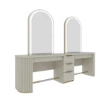 Oglinzile sunt prevăzute cu iluminare LED perimetrală, oferind lumină uniformă, fără umbre, esențială pentru precizia serviciilor de coafură și styling.
