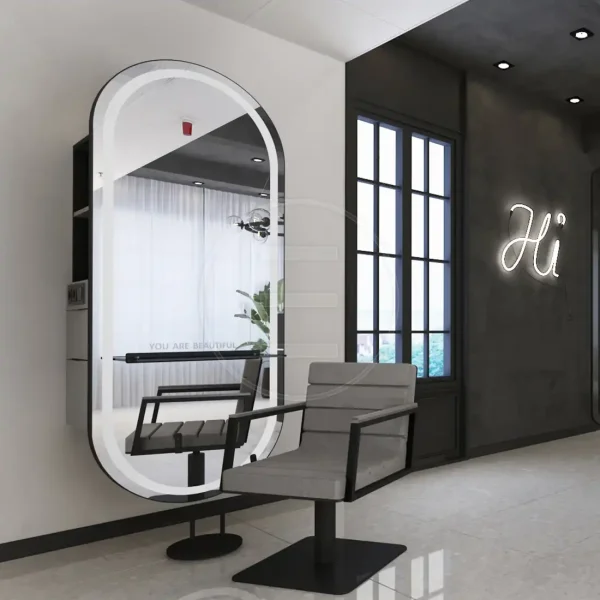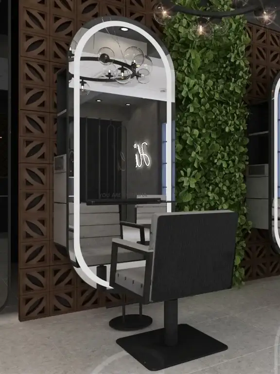 Oglinda de mari dimensiuni, cu formă ovală și iluminare LED perimetrală, creează un efect vizual sofisticat și asigură o lumină uniformă, ideală pentru servicii profesionale. Silueta subțire și finisajele contrastante (structură închisă la culoare + detalii luminoase) oferă un look modern, premium.