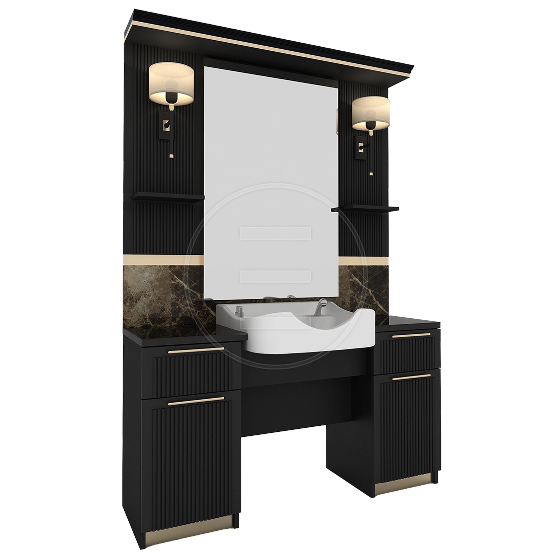 Decorul cu membrana neagra și benzile elegante de margine din inoxidabil auriu ofera un aspect modern, maximizand in acelasi timp functionalitatea. Chiuveta speciala pentru *barbering* ofera cel mai potrivit spațiu de lucru pentru frizeri prin designul sau spatios.