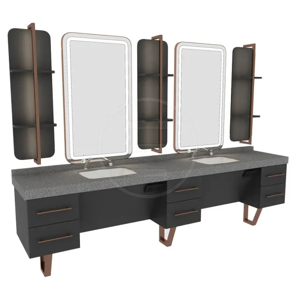 De o parte și de alta a oglinzilor sunt amplasate module verticale cu rafturi deschise, ideale pentru expunerea și organizarea produselor profesionale, accesoriilor sau elementelor decorative. Acestea sunt integrate într-un design elegant, cu panouri metalice decorative ce adaugă un accent modern și sofisticat.