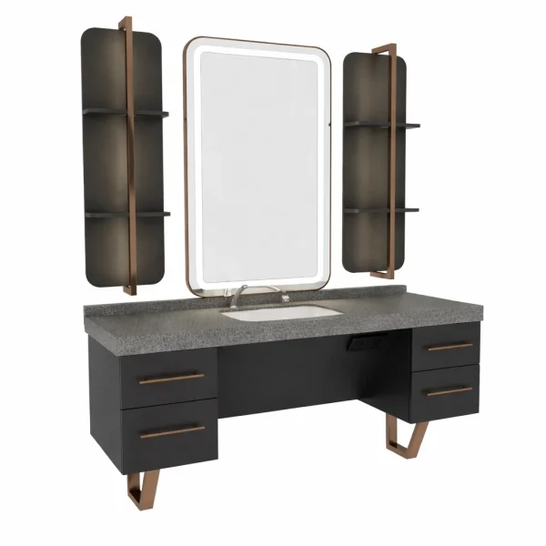 De o parte și de alta a oglinzilor sunt amplasate module verticale cu rafturi deschise, ideale pentru expunerea și organizarea produselor profesionale, accesoriilor sau elementelor decorative. Acestea sunt integrate într-un design elegant, cu panouri metalice decorative ce adaugă un accent modern și sofisticat.