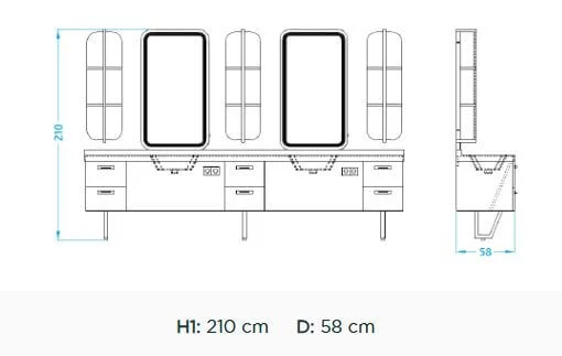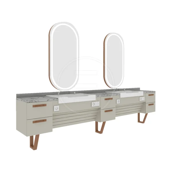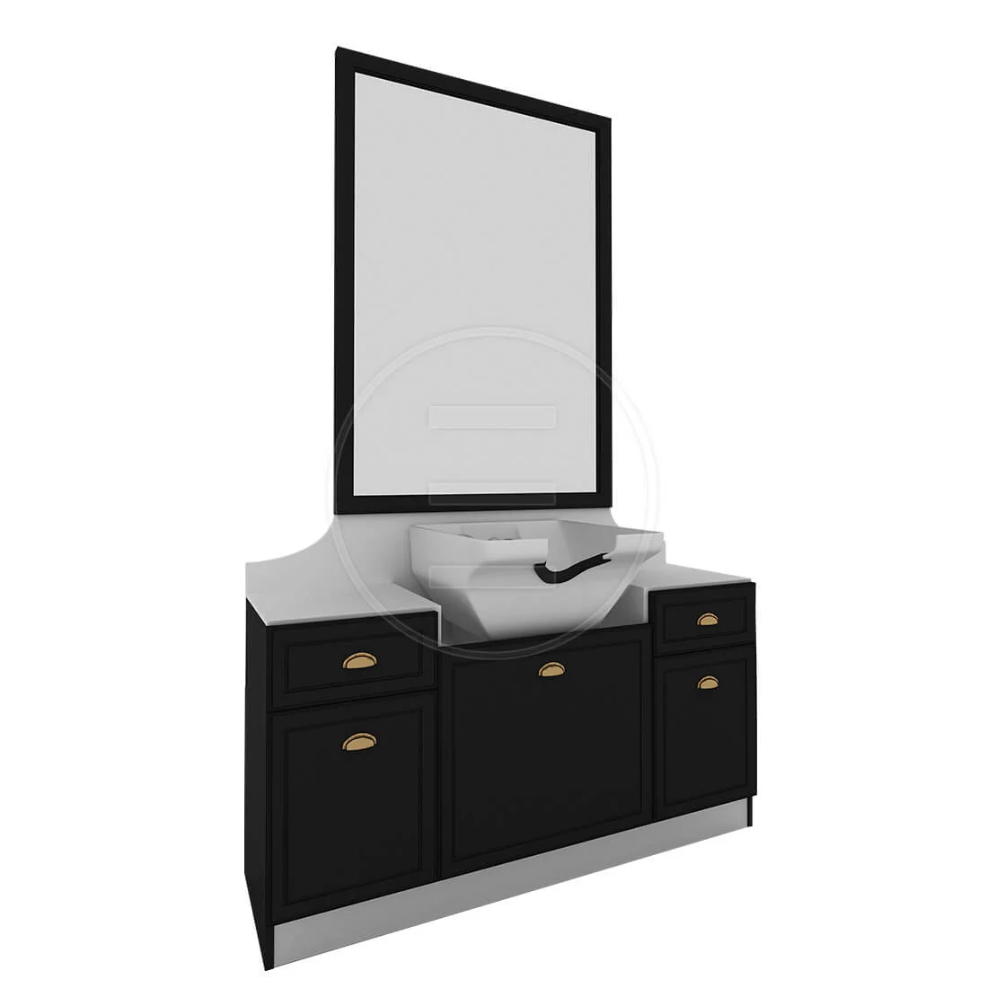 De o parte și de alta a oglinzilor sunt amplasate module verticale cu rafturi deschise, ideale pentru expunerea și organizarea produselor profesionale, accesoriilor sau elementelor decorative. Acestea sunt integrate într-un design elegant, cu panouri metalice decorative ce adaugă un accent modern și sofisticat.