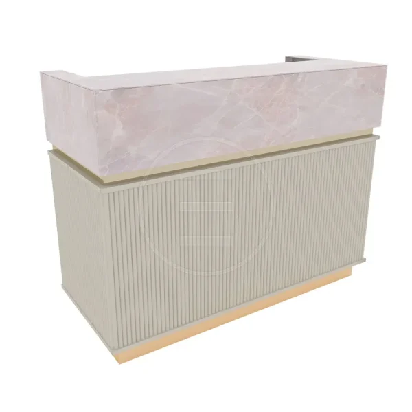 Partea superioară a recepției este finisată cu un decor de marmură verde cu vene albe, oferind un aspect luxos și distinct. Linia aurie subtilă dintre partea superioară și corpul principal adaugă un detaliu elegant, evidențiind designul modern al mobilierului.