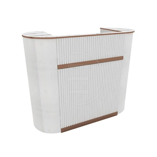 Elementele decorative în nuanță caldă de lemn evidențiază liniile recepției și creează un contrast estetic plăcut, completând armonios designul general. Blatul superior are un finisaj cu aspect de marmură, adăugând o notă premium și accentuând eleganța mobilierului.