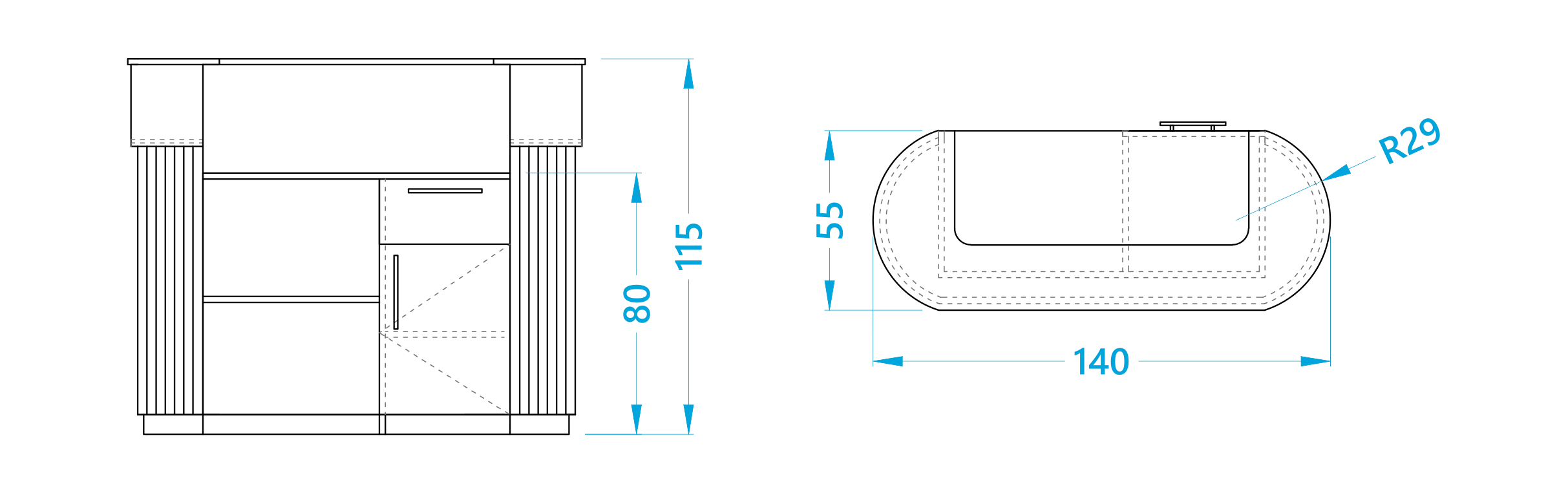Blatul superior are o formă ergonomică, adaptată pentru o utilizare confortabilă în activitatea zilnică, oferind spațiu suficient pentru interacțiunea cu clienții și organizarea echipamentelor de lucru. Liniile rotunjite ale colțurilor adaugă eleganță și contribuie la un design armonios și modern.