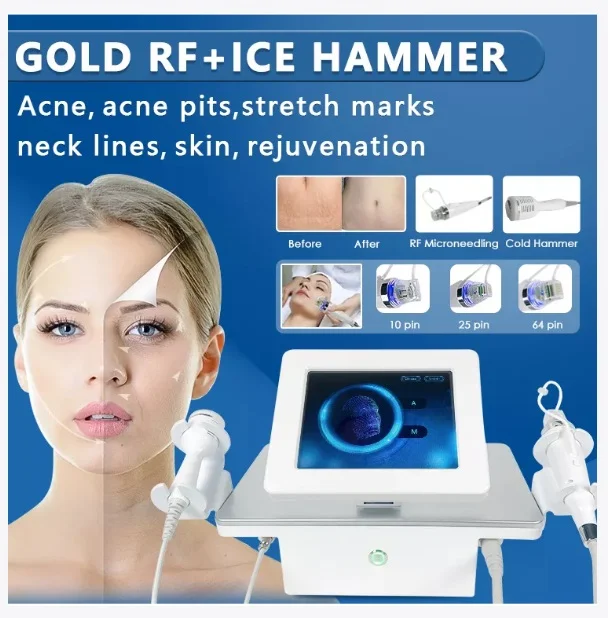 Aparat 2 in1 Golden Microneedeling si ciocan rece, tratament antiacneic, RF lifting, indepartare vergeturi si cicatrici, skin rejuvenation