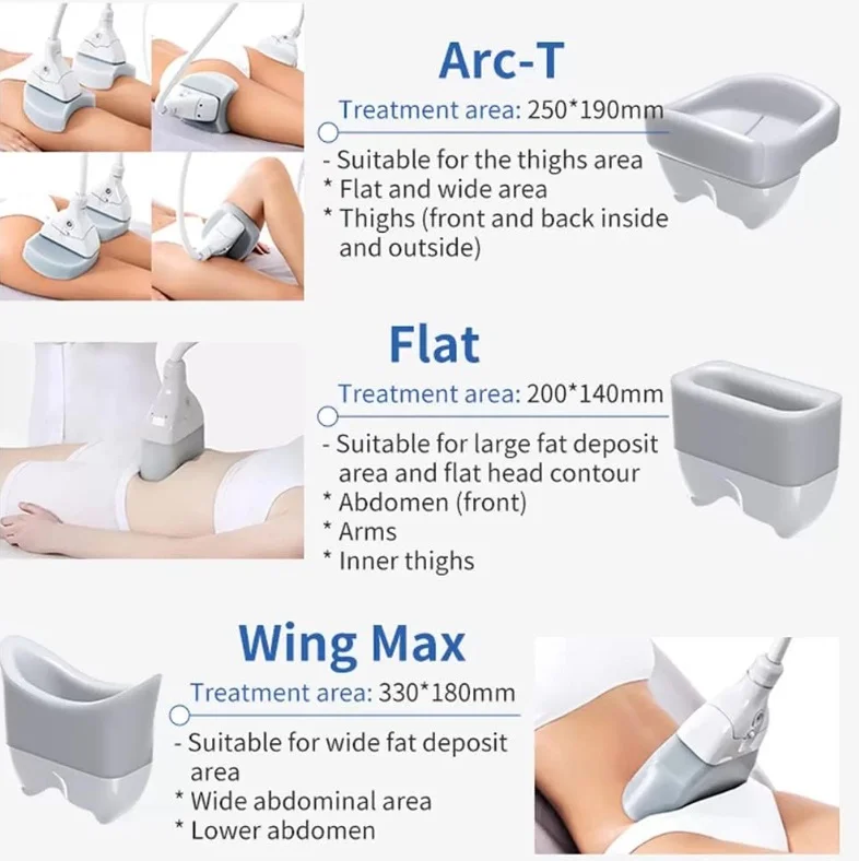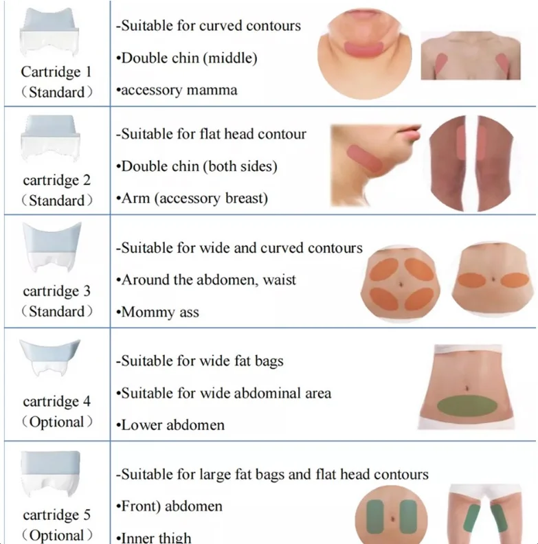 Este echipat cu șase sonde de silicon semiconductoare înlocuibile. Sonda de tratament de diferite forme și mărimi sunt flexibile și ergonomice, astfel încât să se adapteze la tratamentul conturului corpului și sunt concepute pentru a trata bărbia dublă, brațele, abdomenul, talia laterală, fesele (sub șolduri). Acumularea de grăsime în coapse și alte părți. Instrumentul este echipat cu două mânere pentru a funcționa independent sau sincron. Când sonda este plasată pe suprafața pielii unei zone selectate de pe corpul uman, tehnologia de presiune negativă în vid încorporată a sondei va capta țesutul subcutanat al zonei selectate. Înainte de răcire, poate fi efectuată selectiv la 37°C până la 45°C timp de 3 minute. Faza de încălzire accelerează circulația sanguină locală, apoi se răcește de la sine, iar energia de îngheț controlată cu precizie este furnizată părții desemnate. După ce celulele adipoase sunt răcite la o anumită temperatură scăzută, trigliceridele sunt transformate din lichide în solide, iar grăsimea îmbătrânită este cristalizată. Celulele vor suferi apoptoză în 2-6 săptămâni, apoi vor fi excretate prin sistemul limfatic autolog și metabolismul hepatic. Poate reduce grosimea stratului de grăsime al locului de tratament cu 20%-27% simultan, poate elimina celulele adipoase fără a deteriora țesuturile din jur și poate realiza localizarea. Efect de sculptare corporală care dizolvă grăsimea. Criolipoliza poate reduce fundamental numărul de celule adipoase.