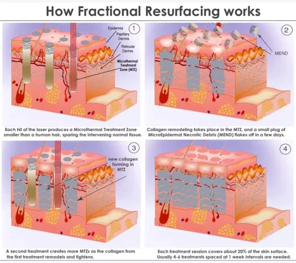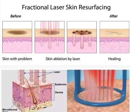 Laserul fracțional Co2 penetrează pielea și formează canale termice minuscule. Acest lucru creează un efect termic ablativ numai pe aceste canale (o micro-vătămare) fără a deteriora țesutul din jur. Țesuturile din jurul micro-leziunilor (aproximativ 15-20% din suprafața de tratament) încep procesul de vindecare. Pe măsură ce colagenul remodelează, pielea este intărită, cicatricile și leziunile pigmentate sunt îmbunătățite.