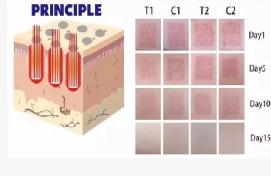 Principiul efectului laser fracționat CO2 este „efectul fototermic focal”. Țesutul pielii are capacitatea de a se repara singur. Pielea a fost rănită în urmă unui traumatism, dar se putea vindecă singură. Zona rănii este prea mare, rezultatele reparării formării cicatricilor. Rana este mică, pielea se poate recupera complet. Laser fracționat fiecare efect asupra pielii numai pe una dintre regiunile mici pentru a genera stimulare termică, porțiunea de reținere a pielii nu este afectată, rolul țesutului pe piele pentru a stimula hiperplazia primirii colagenului și nici un efect al țesutului pielii nu poate fi utilizat că termic regiunea de difuzie, evită posibilitatea rănirii termice și a altor efecte secundare și poate promova rapid vindecarea pielii, poate îmbunătăți cicatricile, porii și întărirea pielii.