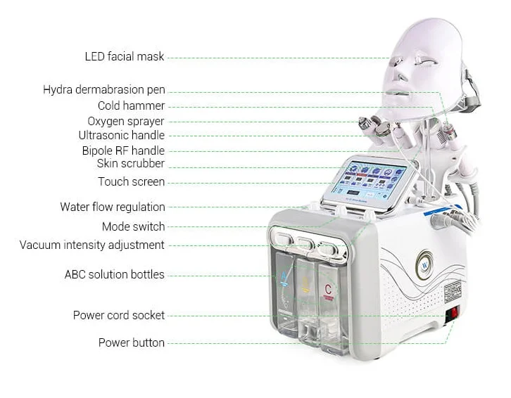 • 7 functii intr-un singur aparat: ultrasunet, RF, hydra dermabraziune, curatare cu vacuum, vibratii, spray cu hidrogen, ciocan rece, masca led