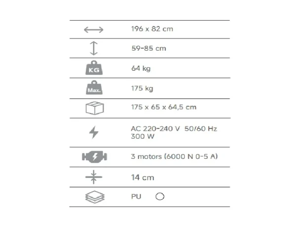 - Reglare electrica pe inaltime (in pozitie plata) 59-85 cm;