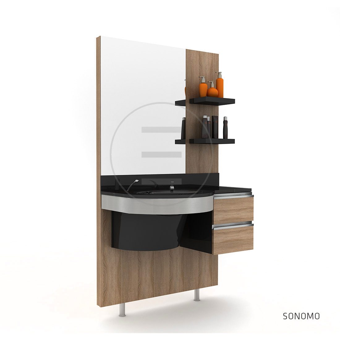 Post de lucru frizerie Alpeda Blacco este prevazut cu vas de sticla, baterii inox rezistente la rugina, polite de lemn, oglinda, sertare.